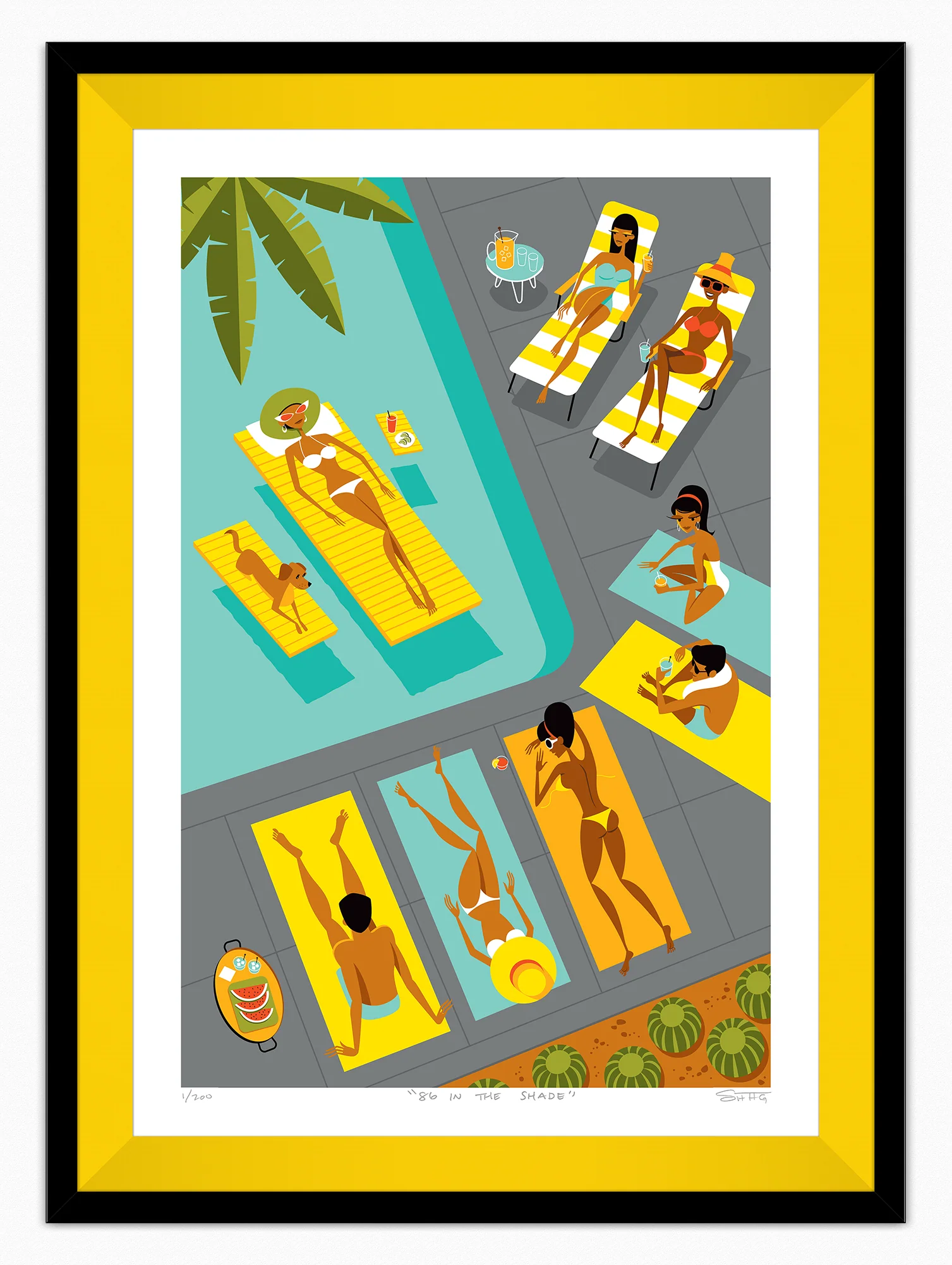Escape the everyday and relax with Shag's 86 in the Shade Fine Art Print! Let Shag (Josh Agle) transport you to the desert resort of your dreams for poolside cocktails and luxurious relaxation. With its bold colors and a summer vibe, hang it up and dive into paradise!